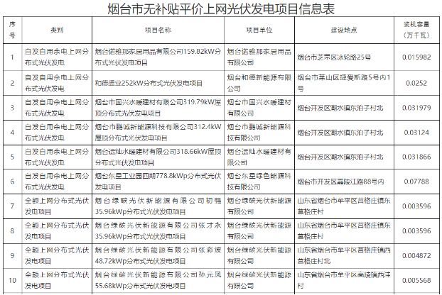 1月6日,煙臺市發改委發布光伏發電項目平價上網確認公告,共21個項目,159.82kW。