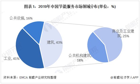 根據中國節能協會節能服務產業委員會(EMCA)2019年對合同能源管理項目進行調查分析的結果顯示,按照節能三大領域分類,工業領域項目有項目總數的41%;建筑領域項目有占項目總數的43%,其中公共機構建筑18%,商業及工業建筑25%;公共設施項目項目總數的16%。