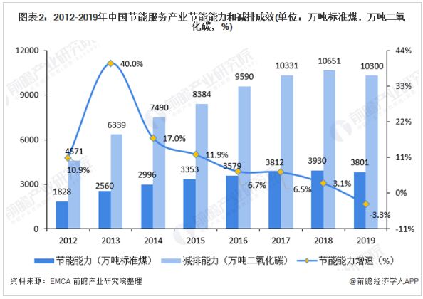 近年來,中國節能服務產業節能能力整體呈上升趨勢,增速則持續下降。2018年,節能服務項目投資對應形成年節能能力3930萬噸標準煤,形成年減排二氧化碳能力10651萬噸。進入2019年,節能能力稍有減弱,合同能源管理項目投資對應形成年節能能力3801萬噸標準煤,形成年減排二氧化碳10300萬噸。