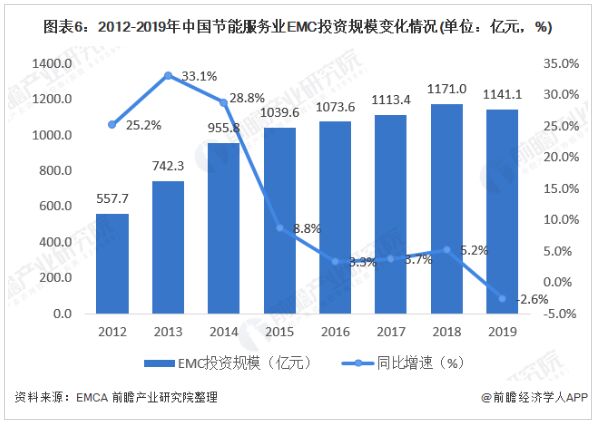 隨著國內節能服務業的迅猛發展,節能服務業合同能源管理(EMC)項目投資也迅速增長。2012-2018年,EMC投資規模維持增長趨勢,投資增速有所下降。2019年我國合同能源管理投資實現2.6%的負增長,達到1141.1億元。