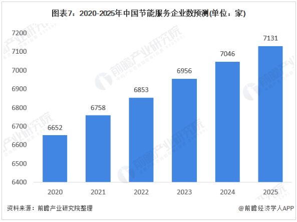 相比較過去粗放增長而言,未來國家將會更加嚴格地規范其資質,節能服務企業數量增長速度可能會有所放緩,預計2020年全國節能服務公司數量將達到約6652家,2025年,全國節能服務企業數量將超過7131家。