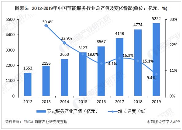 2012年以來,國內節能服務行業發生了迅猛的發展,2019年,中國節能服務產業總產值達到5222億元,同比增長9.4%。