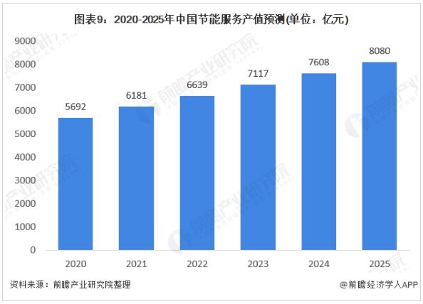 2019年EMCA的數據顯示,我國節能服務產業總產值從2012年的1653億元增長到2019年5222億元,增長速度持續下降。近幾年來,我國節能服務產業利好政策頻發,加上國家對節能環保的重視程度不斷加深。從長遠來看,未來隨著節能服務產業規模的不斷擴大,其發展速度將隨著行業不斷的接近飽和發展而放緩,到2025年,全國節能服務產業總產值將約達到8080億元。