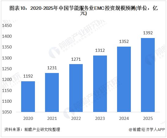 由此可推出2019年中國節能服務的負增長可能是由于供給側改革政策和取消PPP項目以獎代補政策的疊加所致,前瞻預計2020年后節能服務行業EMC投資額仍將保持正增長,但增長速度將低于5%,到2025年達到約1392億元。